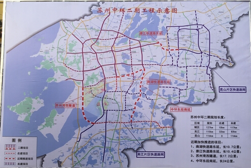 苏州中环城市快速路一期主线部分,已经于7月16日正式通车。目前,中环二期工程也在推进之中,分为苏州城区段、昆山片区段和吴江区段。