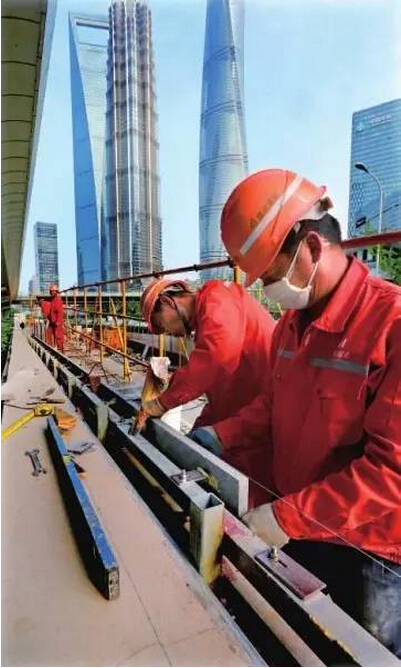 工人们正在延东隧道浦东入口处紧张施工