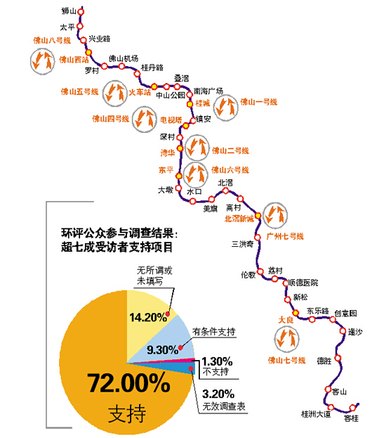 7月20日,佛山市环保局正式发布了“佛山市城市轨道交通三号线工程环境影响报告书受理公告”。这份报告书显示,地铁三号线初期投资估算总额约为419.87亿元,预计时间仍为2015年开工,2020年建成试运营,前期环评调查中已有七成被访公众参与者对该项目支持。