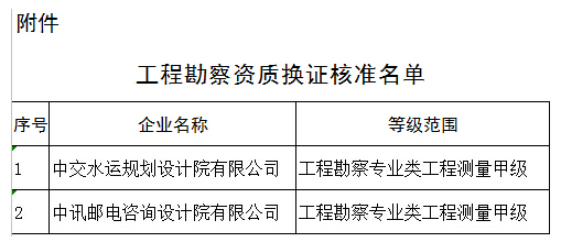 根据《中华人民共和国建筑法》及有关建设工程类企业资质管理规定,经审核,现批准中交水运规划设计院有限公司等2家单位工程勘察资质换证。未予批准的,申请人可登录我部网站(www.mohurd.gov.cn),点击“办事大厅”中“受理发证信息查询”栏目进行查询。