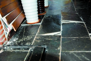 在其提供的照片上,可见3楼的一扇玻璃门整个脱落,地板有瓷砖拱起,墙角也出现裂缝。