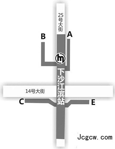 下沙江滨站开通A、B、C、E出口。接驳二十五号路听涛路口、听涛路二十五号路口、下沙江滨公交站、二十五号路十四号大街口等公交站。