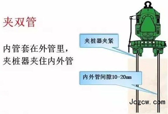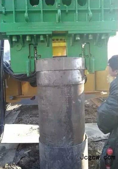 ②起吊双套管:用吊车吊免共振振动锤,并通过夹具将长度超过旧桩长的双套管振入土层中。