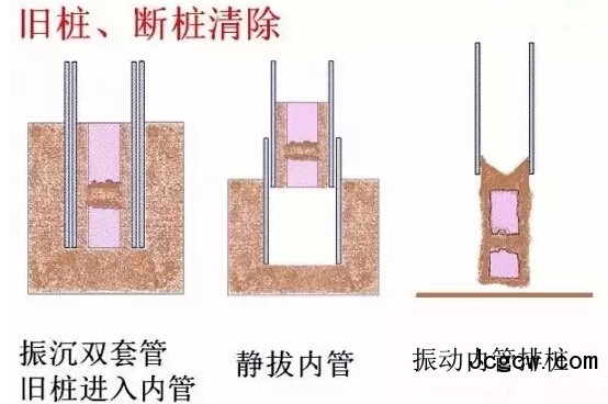 ④静拔内管卸桩:变换夹桩方式,静拔出内管,启功振动锤,管内土与旧桩被振落。