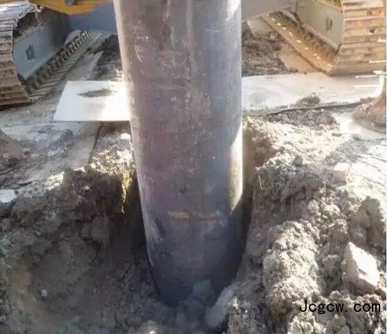①清理桩头:挖去硬壳层,清理出桩头,并探测出旧桩倾斜角度。