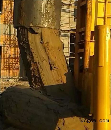 ③遇到斜桩,吊车悬挂的振动锤、夹具、内外管在定位器控制下会沿倾斜的旧桩跟进;