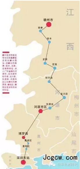 据介绍,赣州至深圳客运专线位于江西、广东两省,北起昌赣客运专线赣州西站,经赣州市南康、信丰、龙南、定南等县后,进入广东省境内河源市,经河源市和平县、龙川县、东源县、河源市区以及惠州市博罗县、惠城区、惠阳区至深圳市深圳东站。