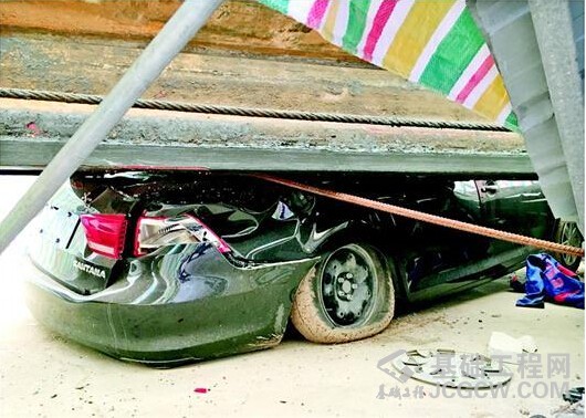 在建打桩机突然倾倒 下方两轿车被砸成“肉饼”
