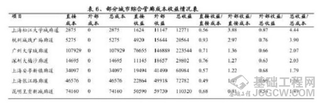 据一项清华大学对部分城市综合管廊的研究(郭莹等),综合管廊的直接收益一般要小于总成本(这里是直接成本);但若计入外部收益,总收益通常要大于总成本。总收益与总成本的比率最高为4.44倍(上海松江大学城廊道),最低也有0.68(陕西蒲城县廊道),平均总收益与总成本的比率约为1.91倍,因此从整个社会角度看综合管廊的投资是有效率的。在总收益中,外部收益所占比重较大,最高为87.3%(上海松江大学城廊道),最低为17.4%(陕西蒲城县廊道),平均约为55%。