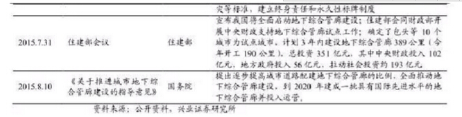 早在2013年发布的《国务院关于加强城市基础设施建设的意见》中,政府就提出提高城市管网、排水防涝、消防、交通、污水和垃圾处理等基础设施的建设质量、运营标准和管理水平,加大城市管网建设和改造力度。在随后发布的《国家新型城镇化规划(2014-2020年)》,再次强调新建城市主干道路、城市新区、各类园区应实行城市地下管网综合管廊模式。