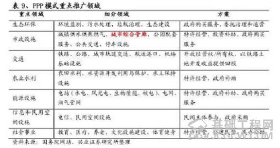 此外,在我们此前发布的PPP模式专题报告《PPP模式—解读新型城镇化的融资之路》中分析认为,结合我国政府当前的政策思路,PPP项目推广首先或主要以轨道交通、污水垃圾处理、供水供电等投资需求大、定价机制相对透明、有稳定现金流、适合市场化经营的项目为主。财政部在此前发布的30个政府和社会资本合作模式(PPP)示范项目则重点推介了供水、供暖、污水处理、垃圾处理、环境综合整治、交通、新能源汽车、地下综合管廊、教育、医疗、体育等多个领域。