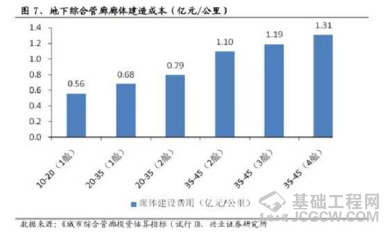 地下综合管廊在廊体单位公里造价约在0.56-1.31亿元之间。地下综合管廊分为廊体和管线,在这里我们仅考虑廊体的建造成本,而廊体造价又与断面面积和舱位数量有关,按照国家试行投资标准估算,断面面积10-20平米、1舱位的廊体1公里造价约为0.56亿元;断面面积35-45平米、4舱位的廊体1公里造价约为1.31亿元,