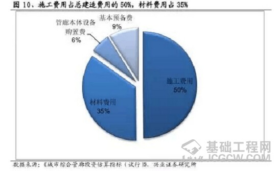 此外,在廊体建造成本中,施工成本占一半,材料成本占比超过1/3。我们以断面面积20-35平米、2舱的廊体为计算标准,1公里施工成本约为0.40亿元,占比约为49.83%,1公里材料费用约为0.28亿元,占比约为35.06%,其余为设备购臵费与基本预备费,其中基本预备费是指在投资估算阶段不可预见的工程费用;