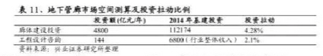 理性的分析,千亿管廊市场对基建投资的拉动其实有限。经测算,每年廊体投资约3200-6400亿元,取均值,为4800亿元,占占2014年基建投资(11.22万亿)比为为4.28%;具体到勘察设计行业,我们按廊体投资的3%计算勘察设计费,预计每年地下管廊的工程勘察设计业务投资额约为144亿元,占占2014年我国工程咨询行业营业收入为的比例为2.1%;此外从增量空间考虑,给排水管线等管线工程已在城市相关规划投资之中,地下综合管廊只是把相关管线集中建设,