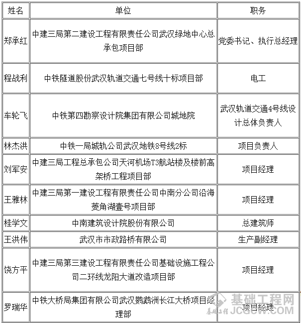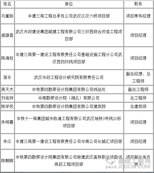出席当天评审会的评委有:全国工程设计大师、铁四院副院长王玉泽;全国工程设计大师、中交二公院副总经理兼总工程师廖朝华;华中科技大学建筑与城市规划学院原院长李保峰;武汉建筑业协会副会长兼秘书长李淼磊;武汉市监理协会会长汪成庆;武汉建筑业协会总工程师工作委员会副主任兼秘书长安维红。社会形象评委有:湖北日报传媒集团副总编辑赵洪松;武汉大学新闻与传播学院副院长程明;中国管理科学院武汉分院副院长胡润州。