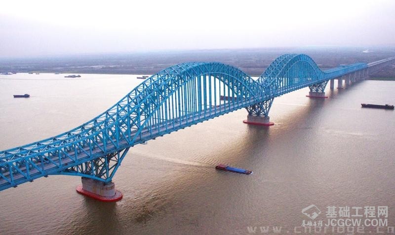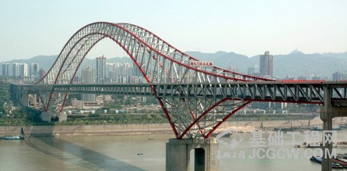 重庆朝天门长江大桥(图6),全长1741m,其中主桥长932m,为190m+552m+190m的中承式连续钢桁系杆拱桥,主跨552m,是世界第一拱桥,有两层桥面,上层为双向6车道和两侧人行道,下层为双向城市轻轨车道。灌注群桩基础加承台,每个承台基基桩为3排12根桩径为2.5m的群桩。
