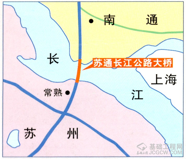江苏苏通长江公路大桥分南、北接线和主桥三大块,南接线长9.1km,北接线长15.1km,主桥全长2088m,主跨斜拉桥长1088m;是世界最长的斜拉桥,荣获美国国际桥梁协会George Richardson奖。该桥索塔高300.4m,为世界第一高桥塔。桥塔、桥墩基础采用了φ(2.5~2.8)m×(101~119)m长的钻孔灌注桩。见图3。