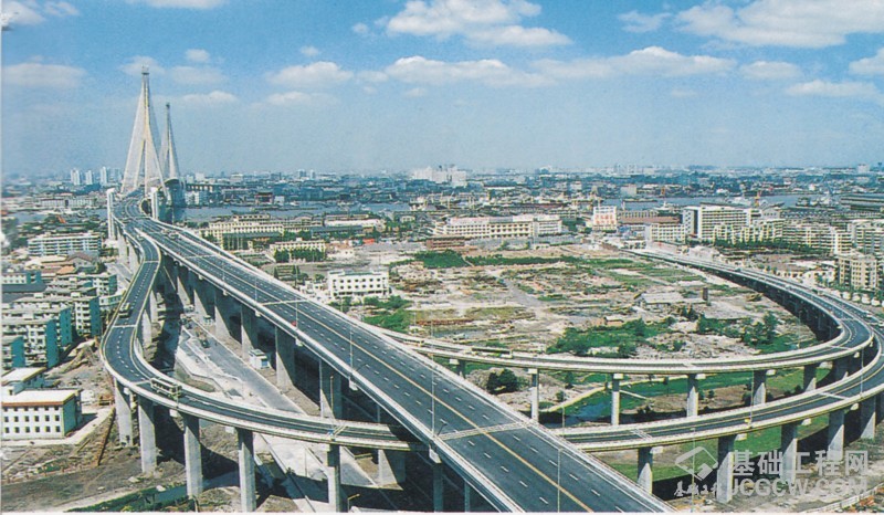 上海杨浦大桥见图8,它是上海市区内跨越黄浦江连接浦西老区与浦东开发区的重要通道,全长8354m,主桥长1178m,为双塔空间双索面组合梁斜拉桥。主塔基础采用钢管桩,辅助墩等采用钢筋混凝土预制桩基础。