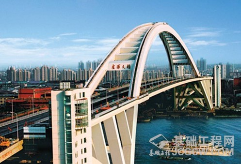 上海卢浦大桥见图9,位于上海市南部,是中承式系杆拱桥,跨度组合为100m+500m+100m,主跨采用Φ900mm钢管桩,并用Φ700mm水泥土搅拌桩加固地基。