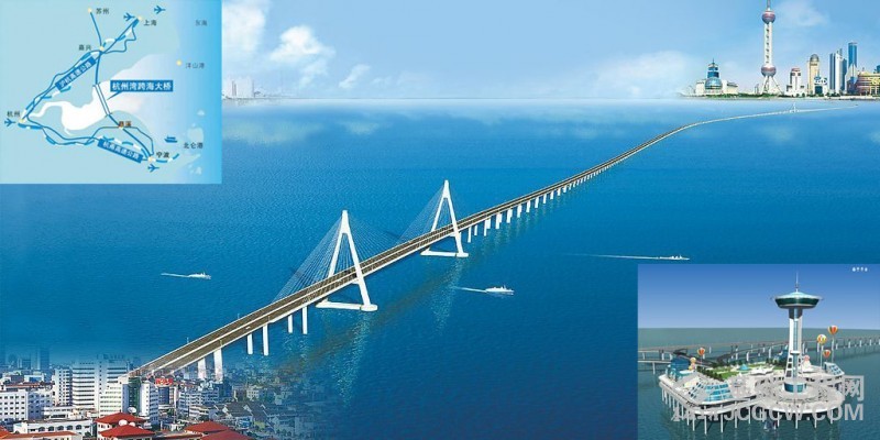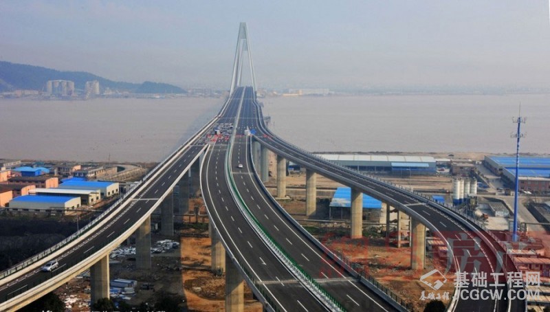 浙江杭州湾跨海大桥,全长36km,其总平面呈S形,是世界最长跨海大桥,630座桥墩采用了3550根钻孔灌注桩和5474根钢管桩,桩长71-89m。参见图12,该图右下角为建于大桥旁、支承于桩基础、面积达1万m2的观景平台,也可作为船只停靠点和加油站。