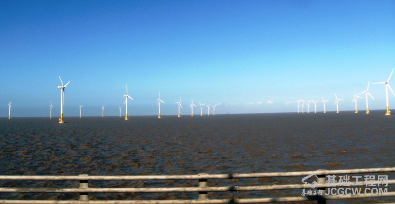 我国首座外海大桥,自上海南汇芦潮港至宁波大小洋山汇的东海大桥,全长32.5km,对塔墩和辅助墩采用Φ2.5m长110m或长85m嵌岩钻孔灌注桩以及Φ1.5m长60m的钢管桩基础;其边墩采用Φ1.5m长85m钢管桩基础。并大规模成功应用了海上砂桩技术。东海大桥东侧1km以外海域的海上风力发电站规模为亚洲最大,共布置34台单机3MW的风力发电机,采用桩基支承。见图16。