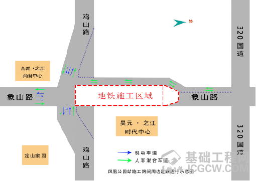 凤凰公园站采用明挖法,但是,十字路口盖板区会采用盖挖顺筑法施工,这样可以减少通行影响。计划总工期约为36个月,其中主体结构施工的近两年时间对交通影响较大。接下来,象山路(320国道以南—鸡山路以北)将封闭机动车通行,在围挡西侧设置双向人非混行道。象山路(鸡山路以南)保持机动车双向2车道,交叉口进口渠化为“2进1出”,慢行交通同现状。