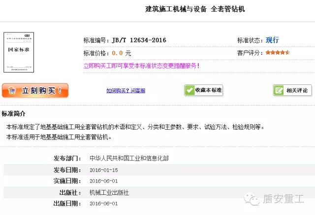 JB/T 12634-2016《建筑施工机械与设备 全套管钻机》标准是我国全套管钻机第一个行业标准,是根据工业和信息化部工信厅科【2013】102号《关于印发2013年第二批行业标准制修订计划》(计划号:2013-0543T-JB)要求起草的。接到标准制定任务后,全国建筑施工机械与设备标准化技术委员会基础施工设备分技术委员会成立了由徐州盾安重工机械制造有限公司为主要起草单位和北京建筑机械化研究院等其他参编单位组成的标准编制工作组,经过标准编制工作组一年多的工作,正式完成了标准的编制。 2014年7月18日全国建筑施工机械与设备标准化技术委员会第二届基础施工设备分技术委员会对标准进行了审查,与会专家一致认为该标准达到了国际水平,同意通过审查。