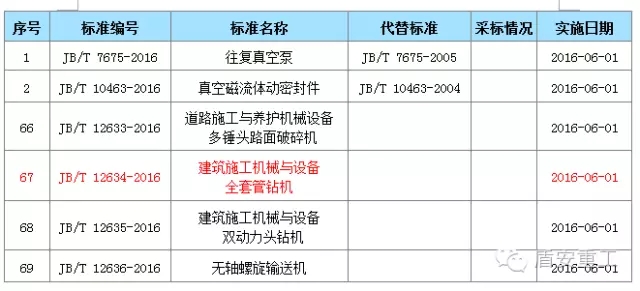 中华人民共和国工业和信息化部发布2016年(第3号)公告,批准发布JB/T 12634-2016《建筑施工机械与设备 全套管钻机》等643项行业标准,自2016年6月1日起正式实施,标志着全套管钻机的制造有了可以遵循的统一标准,有利于全套管钻机行业的规范化发展。