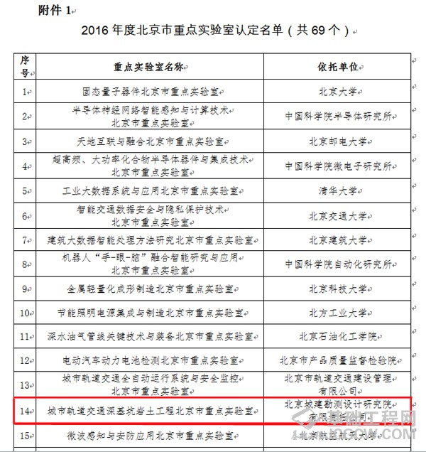 近日,由北京市科委组织的2016年度北京市重点实验室及工程技术中心评审在网上公示了认定名单,北京城建勘测设计研究院成功获批“城市轨道交通深基坑岩土工程北京市重点实验室”。
