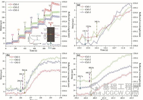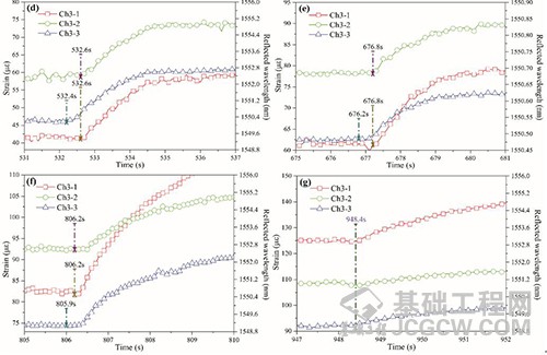 变围压/孔压下的岩心水驱试验共进行6套方案,以方案2中传感阵列Ch3为例,即孔压恒定为2 MPa、孔压从0.5 MPa变为2 MPa(图1左上角第一图所示)。当去离子水连续注入饱水岩心,将会有出现7次显著跳跃点(a)~(g)。通过局部放大图,可以看到用三个轴向FBG传感器实时监测到的压力前缘的初始到时。特别有趣的是,低孔压下,属于同阵列Ch3的三个传感器的初始到时相差1-6 s,但高孔压下,时差变小甚至重合。但物质前缘界面未能在曲线上清晰地响应出来,主要是驱替流体本身对FBG传感器的影响相对较小。理论上,这与太沙基原理相吻合,随着有效应力减小,会导致有效应变的减小。另外,随着有效应力的减小,即孔压增大,三个FBG传感器测得的初始到时时差越来越小,最后甚至为零(如图1所示)。因此,实际驱油工程中,尽可能减小储层有效应力,进而提高驱油时效,减少工程作业时间和成本等。