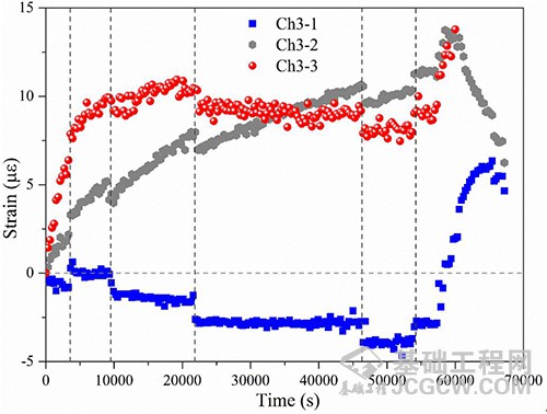 水驱试验结束后,将气态CO2从饱水砂岩底部注入进行气驱试验研究。结果表明:对于CO2-水两相流,密度小的CO2由于浮力和毛细作用将会上移到岩心顶部,同时因差压而发生侧向延伸流动。大约经过19.3h,CO2羽到达岩心上部(如图2所示)。但是,由于试样顶部密闭,不同于传感器Ch3-2和Ch3-3处的气态CO2,传感器Ch3-1处的气态CO2会随着注入持续进行累积。因此,当砂岩底部持续注入CO2,就会导致试样顶部静水压力逐渐增大,因为顶部空间的去离子水会被上涌的CO2驱替排开,会迫使水向试样底部缓慢移动,进一步导致有效应力减小。尽管测得的应变历史出现了一些波动(机理尚待进一步解释),但原始试验结果对指导后续不同边界条件的驱替试验研究、数值模拟和现场应用具有重要的指导意义,也为流体注入诱发的地质力学场微小变化的监测提供机理解释,最终目标是为CCUS现场高精度智能监测网络系统的搭建提供技术支撑。