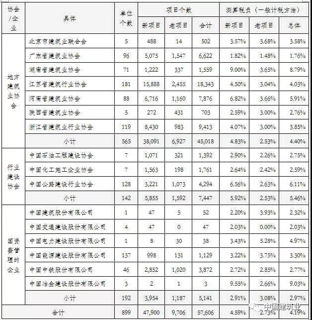 此外,由于采取一般计税的大中型项目完工并完成决算的很少,此次对于一般计税项目税负的反映,是建筑业企业根据项目实际已确认销项税额及已抵扣进项税额情况提供的数据,测算结果仅是一般计税项目阶段性税负情况。考虑到大多数项目在项目前期基本完成采购,取得大部分进项税额,随着后期工程结算确认的销项税额增多,预期项目完工税负还会大于目前测算的税负结果。