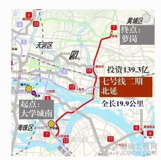 7号线二期从现有一期的大学城南站,向北延伸约至黄埔区,较高运行速度80km/h,设有深井、长洲、洪圣沙、裕丰围、大沙东、姬堂、加庄、科丰路、萝岗、水西、水西北等11座车站。