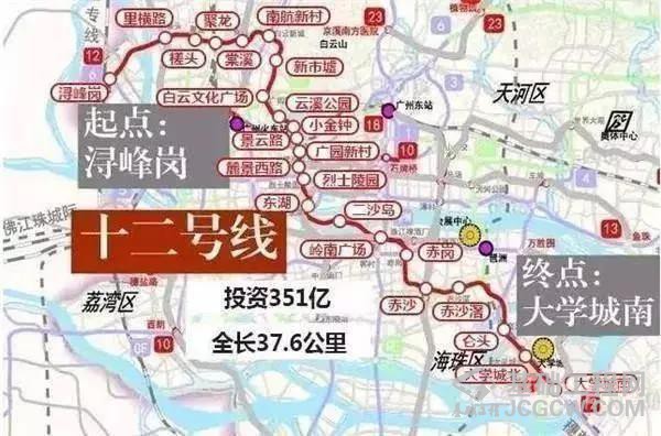 12号线共设25个站点,其中就有16个为换乘站,规划沿线经槎头、棠溪、新市、白云公园、麓湖、淘金、赤岗、官洲、大学城,止于大学城南站,线路主要经过白云区、越秀区、海珠区、番禺区。