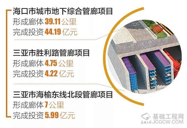 据了解,目前海口市、三亚市有三个试点项目已经总共完成投资54.4亿元,形成廊体50.86公里。海口市城市地下综合管廊项目形成廊体39.11公里,累计完成投资44.19亿元,其中10.3公里廊体已通过验收;三亚市胜利路管廊项目形成廊体4.75公里,完成投资4.22亿元;三亚市海榆东线北段管廊项目形成廊体7公里,完成投资5.99亿元。