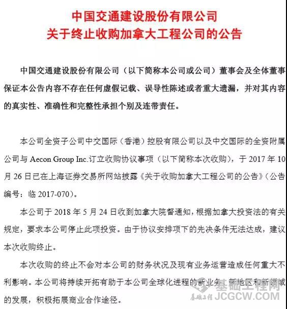 5月25日中国交建发布公告,决定终止收购加拿大最大建筑公司Aecon。加拿大联邦政府以“国家安全”为由,阻止中国交建子公司收购阿肯集团。阿肯集团称对政府的决定感到失望。
