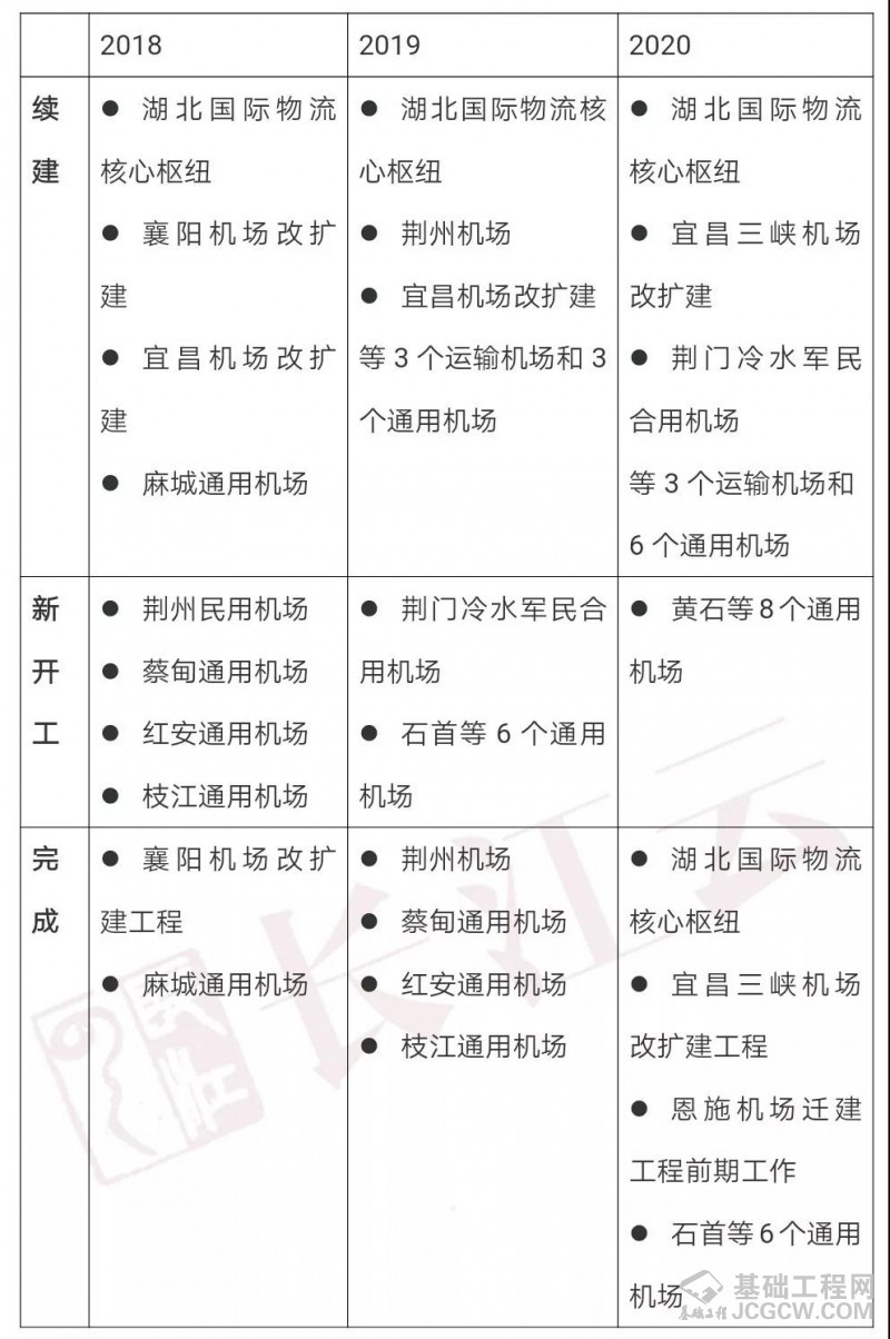 全面开工并基本建成湖北国际物流核心枢纽项目,完成新建荆州机场和改扩建襄阳、宜昌机场,力争到2020年建成运输机场达到8个。启动实施荆门冷水机场军民合用工程,加快推进恩施机场迁建等前期工作,研究推进神农架机场与周边通用机场互动发展。建成麻城、蔡甸等一批通用机场,力争3年内建成和在建通用机场达到23个(其中建成通用机场达到15个),努力实现所有市(州)拥有通用机场或兼顾通用航空服务的运输机场。