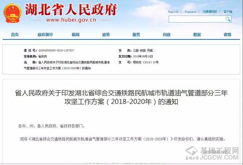 湖北省政府官网发布了《湖北省综合交通铁路民航城市轨道油气管道部分三年攻坚工作方案(2018-2020年)》。