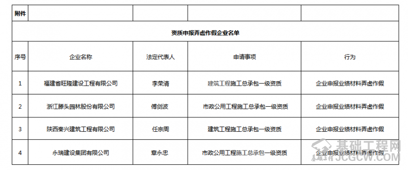 经查,福建省旺隆建设工程有限公司等4家建设工程企业在资质申报过程中存在弄虚作假行为。根据《中华人民共和国建筑法》《中华人民共和国行政许可法》及《建设工程企业资质申报弄虚作假行为处理办法》(建市〔2011〕200号)等规定,决定对福建省旺隆建设工程有限公司等4家建设工程企业予以通报批评,不批准其资质申请,并将其不良行为在全国建筑市场监管公共服务平台予以公布。自本通报印发之日起1年内不受理上述企业申请该项行政许可。