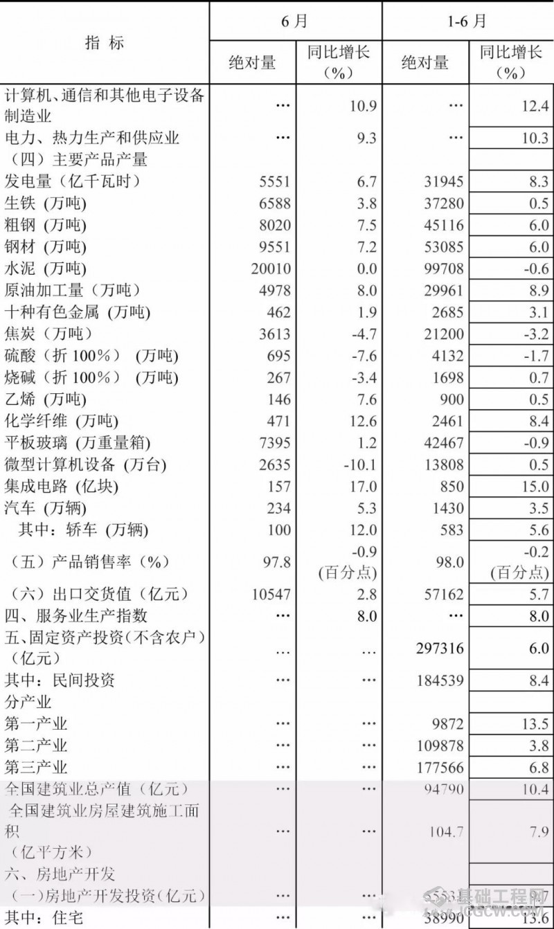 7月16日,国家统计局公布了上半年全国经济运行情况。经初步核算,上半年国内生产总值418961亿元,按可比价格计算,同比增长6.8%。其中,上半年全国建筑业总产值94790亿元,增长10.4%,全国建筑业房屋建筑施工面积104.7亿平方米,增长7.9%。