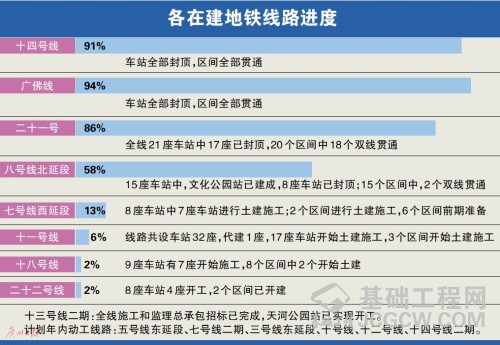 进度紧随其后的是东西大动脉十三号线二期,线路全长33.5公里,共设车站23座,其中换乘站9座,最高运行速度100公里/小时。截至6月底,全线施工和监理总承包招标已完成,天河公园站已实现开工。