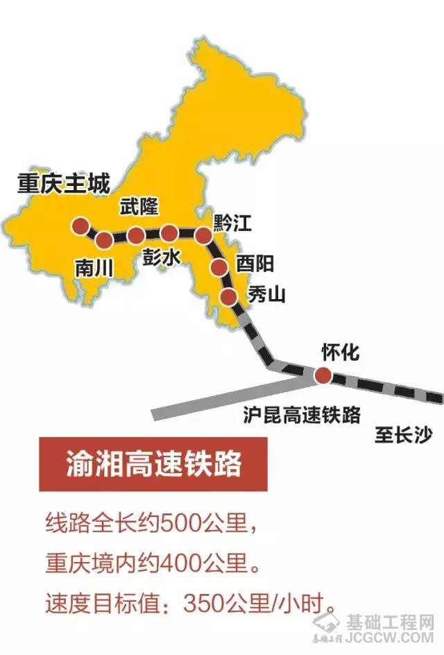 线路自重庆主城-南川-武隆-彭水-黔江-酉阳-秀山-怀化接沪昆高速铁路至长沙。350公里的时速,将重庆和湖南快速连接。渝湘高铁将逐步实现重庆的“米”字交通。 技术标准为双线电气化铁路, 设计速度目标值为350公里/小时。