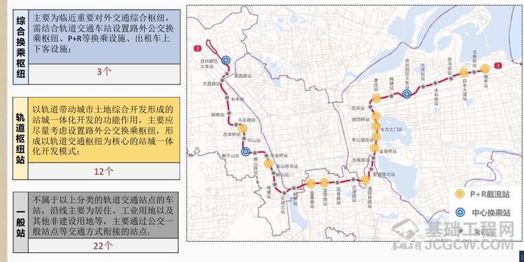 苏州轨交3号线为东西向线路,经高新区、姑苏区、吴中区、工业园区,线路起于沪宁高铁新区火车站,终于工业园区阳澄湖半岛南侧的唯亭站,全长约45.2公里,设站37座,其中换乘车站15座。根据规划,3号线共设置综合换乘枢纽3个,主要为临近重要对外交通综合枢纽,需结合轨道交通车站设置路外公交换乘枢纽、P+R等换乘设施、出租车上下客设施,分别位于苏州新区火车站、狮子山站和苏州园区火车站;轨道枢纽站12个,以轨道带动城市土地综合开发形成的站城一体化开发的功能作用,主要应尽量考虑设置路外公交换乘枢纽,包括西津桥站、索山桥西站、盘蠡路站、宝带路站、通园路南站、金厍桥站、李公堤西站、东方之门站、烟雨桥站、唐庄站、葑亭大道站和唯亭站;其余22个为一般站,主要通过公交一般站点等交通方式衔接的站点。