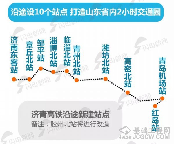 2015年12月20日开工建设,8月2日正式联调联试,确保2018年年底全线通车。济南至青岛高速铁路贯通山东半岛,自济南东站引出,经章丘、邹平、淄博、临淄、青州、潍坊、高密、胶州,引入青岛红岛站,线路全长307.8公里。全线设济南东站、章丘北站、邹平站、淄博北站、临淄北站、青州市北站、潍坊北站、高密北站、胶州北站、青岛机场站、红岛站等11个车站,最高运营时速350公里,初期运营时速300公里,济南至青岛运行时间由原来的近2个半小时缩短至约1小时。
