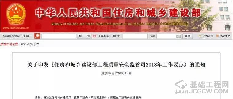 近日,住建部印发关于《住房和城乡建设部工程质量安全监管司2018年工作要点》的通知(建质综函[2018]15号)(下文简称《通知》)。