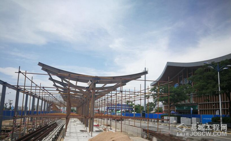 当天,工人们正在对停靠站点的遮阳棚框架进行焊接,待有轨电车站台及轨道铺设完成后,市民及游客乘坐动车从三亚站出站后,就可以在这里乘坐有轨电车到达市区。