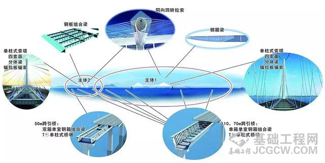 580m主跨单柱式双塔四索面分体钢板组合梁斜拉桥整体风格、造型与伶仃西航道桥形成呼应。钢材和混凝土两种材料在桥梁中相互组合,功能互补。桥梁整体强度、刚度获得平衡。
