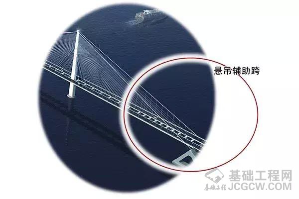 450m边跨设计为全斜拉区。强大的尾索保证了桥梁整体刚度,提供的轴向压力可突破至主跨主梁悬吊区,克服主梁内力间断。150m边跨尾端设计为交叉吊索区,形成局部刚度加强的悬吊辅助跨,解决了边跨因不能设置辅助墩,活载变形大,尾索应力幅高的特殊问题。
