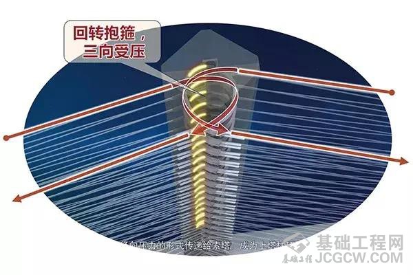 计算表明,利用拉索横桥向索力差低,长回转段摩擦力大特性,以鞍座进行沿程摩阻锚索,可轻松满足抗滑移要求,最不利拉索抗滑移安全系数大于5,远超过规定的2。拉索绕索塔产生延程环形径向压力,塔壁按拱式结构进行工作,全压力保证了长效锚索,且三向压应力小于7Mpa,处于0~17.5Mpa理想区间。