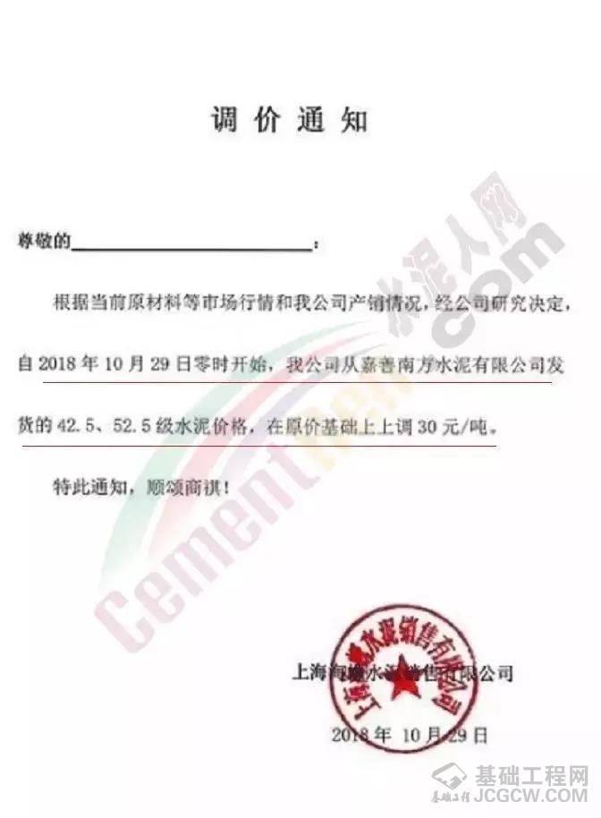日前,上海海螺水泥销售有限公司发了一份南方水泥的涨价通知,从中不难看出几大水泥集团合作互赢的关系,涨价函称经公司研究决定自10月29日零时开始,公司从嘉善南方水泥发货的42.5、52.5级水泥价格,在原价基础上上调30元/吨。相关市场人士表示,南方水泥的调价通知由海螺水泥销售公司发出,或是南方水泥区域市场交由海螺水泥销售平台运营的一个“提示函”。